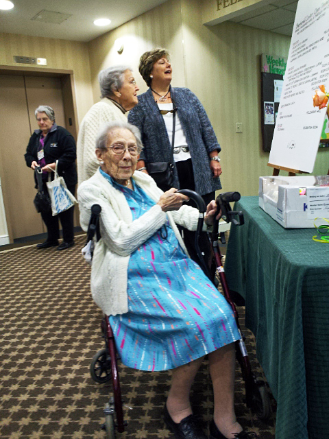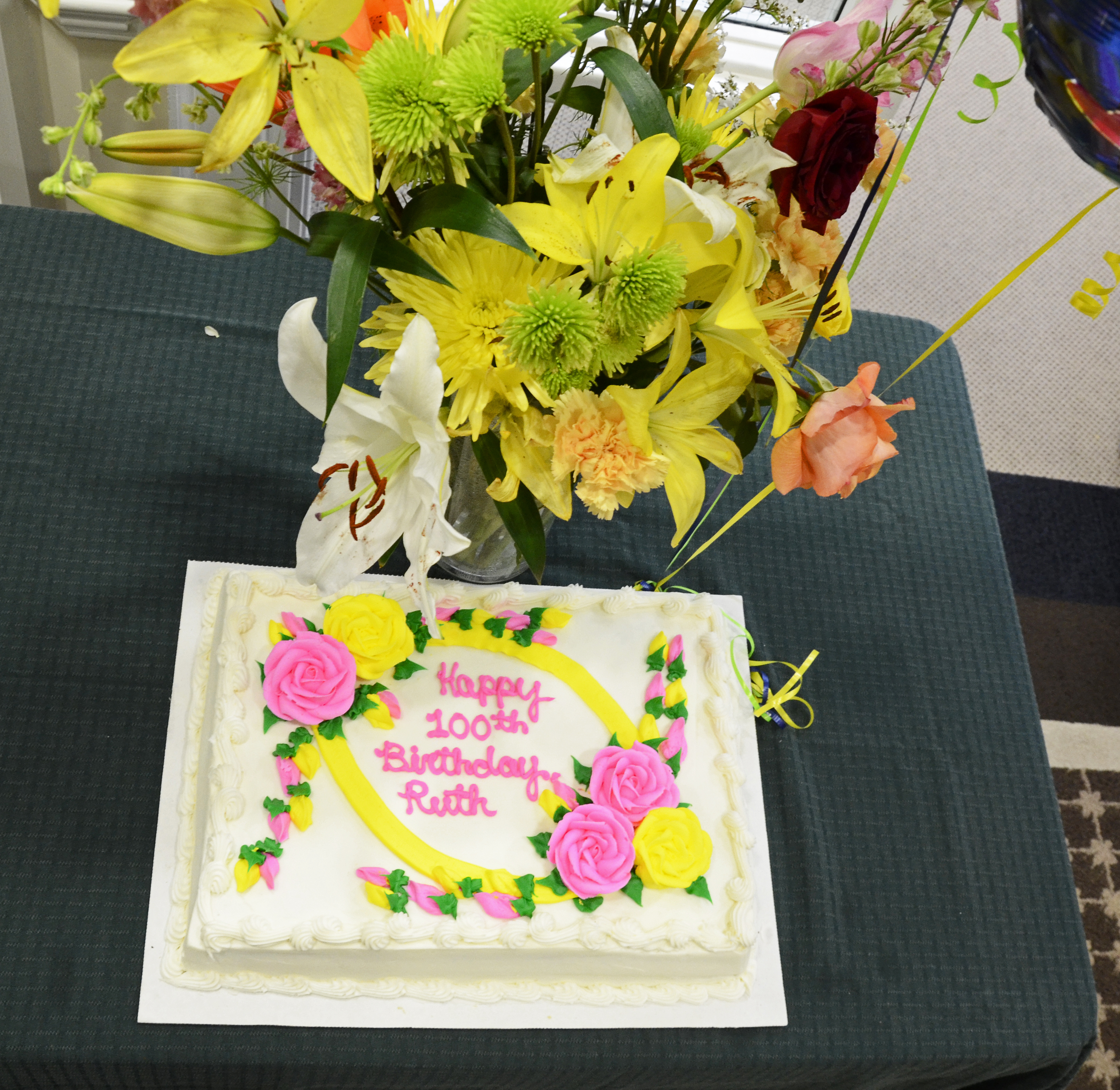 Rosie Whitehorne and Carol Harris arranged a surprise for Ruth at the First Presbyterian OU. There was a cake, balloons, and a bouquet of flowers. When Ruth got out of the elevator, there was a gathering of well-wishers who sang happy birthday to her as she saw the cake.