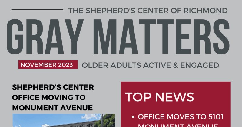 There’s lots of exciting news coming from The Shepherd’s Center! The administrative office is moving into a historic building on Monument Avenue, our Board President, Peter Pettit, is featured in an article in The Richmond Free Press, and we’re forming a new Events committee! All that and more. Stay in-the-know. Read the November, 2023, newsletter – Gray Matters – HERE.