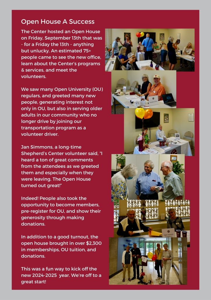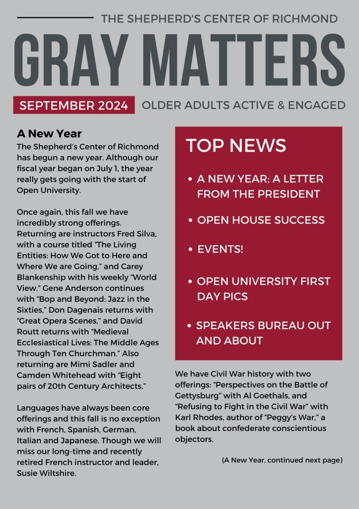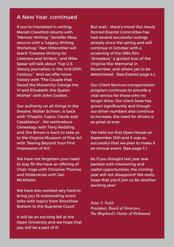 The latest newsletter from The Shepherd’s Center of Richmond is here! Read a letter from the board president highlighting the start of a new year, explore what the Events! committee has going on, and see lots of great pics from the first day of Open University!