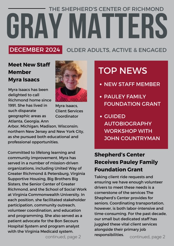 MISSION: The Shepherd’s Center of Richmond encourages older adults to remain active and engaged through enrichment programs and volunteer service to their peers.